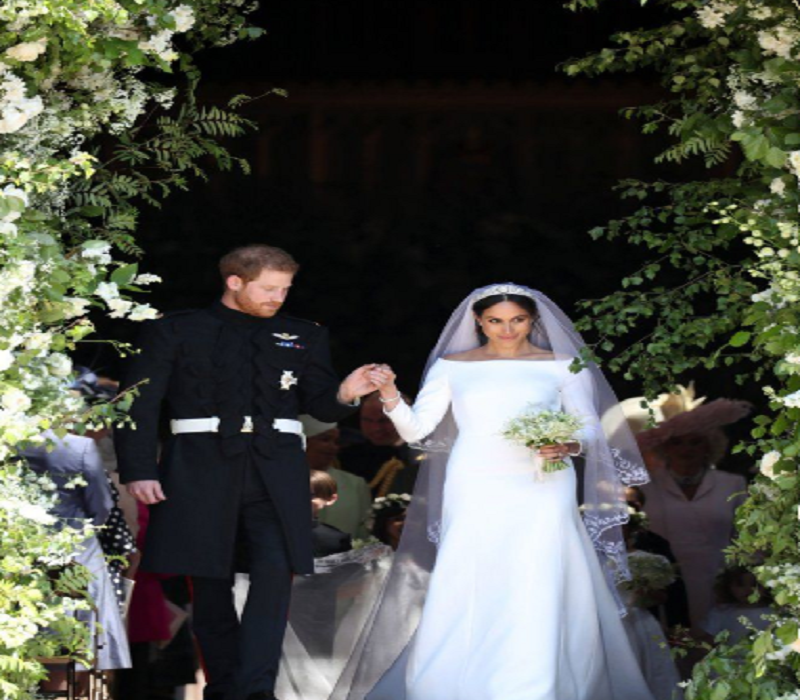 Meghan and Harry married on May 19, 2018, at St. George’s Chapel, Windsor Castle. Around 29.2 million people watched the ceremony on television. Meghan’s white silk wedding dress was designed by Clare Waight Keller of Givenchy. Her five-metre veil carried floral emblems from all 53 Commonwealth nations. She traveled to the chapel by carriage with her mother, Doria. Prince Charles walked her down the aisle. The ceremony featured a Black gospel choir and a sermon by an American bishop. With the marriage, Meghan became the Duchess of Sussex, the first mixed-race member of the modern British Royal Family.